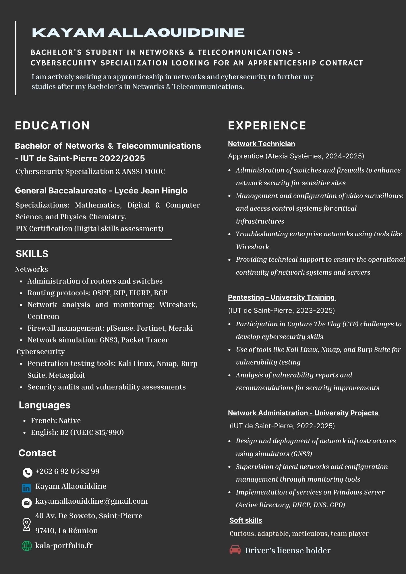 I am a young student in my third year of a Bachelor's in Networks & Telecommunications at the IUT of Saint-Pierre. I hold a general high school diploma with a specialization in Mathematics and Computer Science, awarded with honors